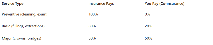 Dental insurance also uses co-insurance to manage cost-sharing between the insurer and patient. Here’s a breakdown of a common structure: